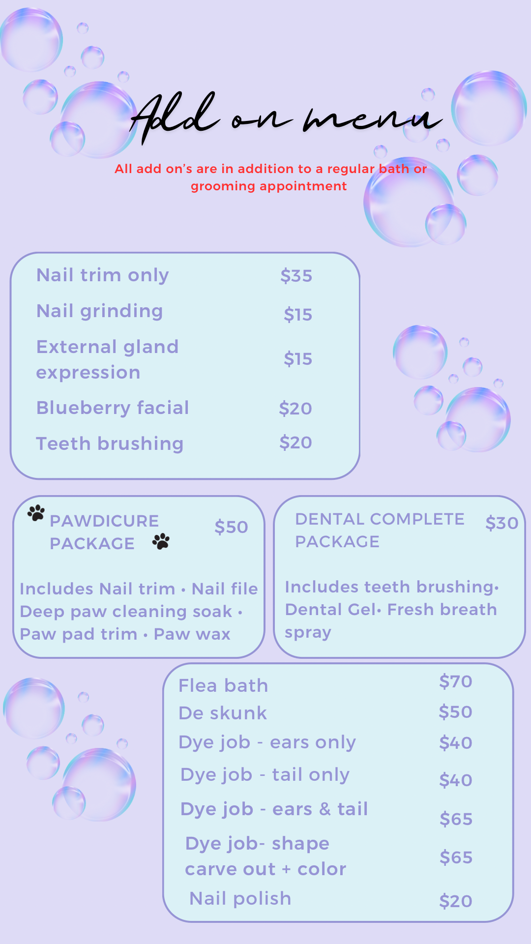 If a flea is found on your dog during service , our groomers will administer a flea shampoo in oder to maintain the sanitation of the mobile salon.