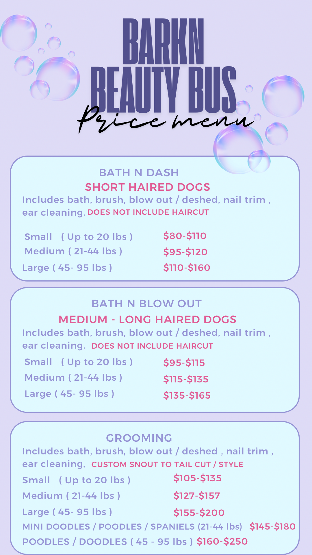 Barkn Beauty Bus reserves the right to refuse any pet if we feel it compromises the safety of your dog or our groomers. Aggressive dogs or dogs who will not get in the van will be refused and charged $65 minimum show up fee for travel , along with additional fees for any work the groomer was able to complete, if applicable .