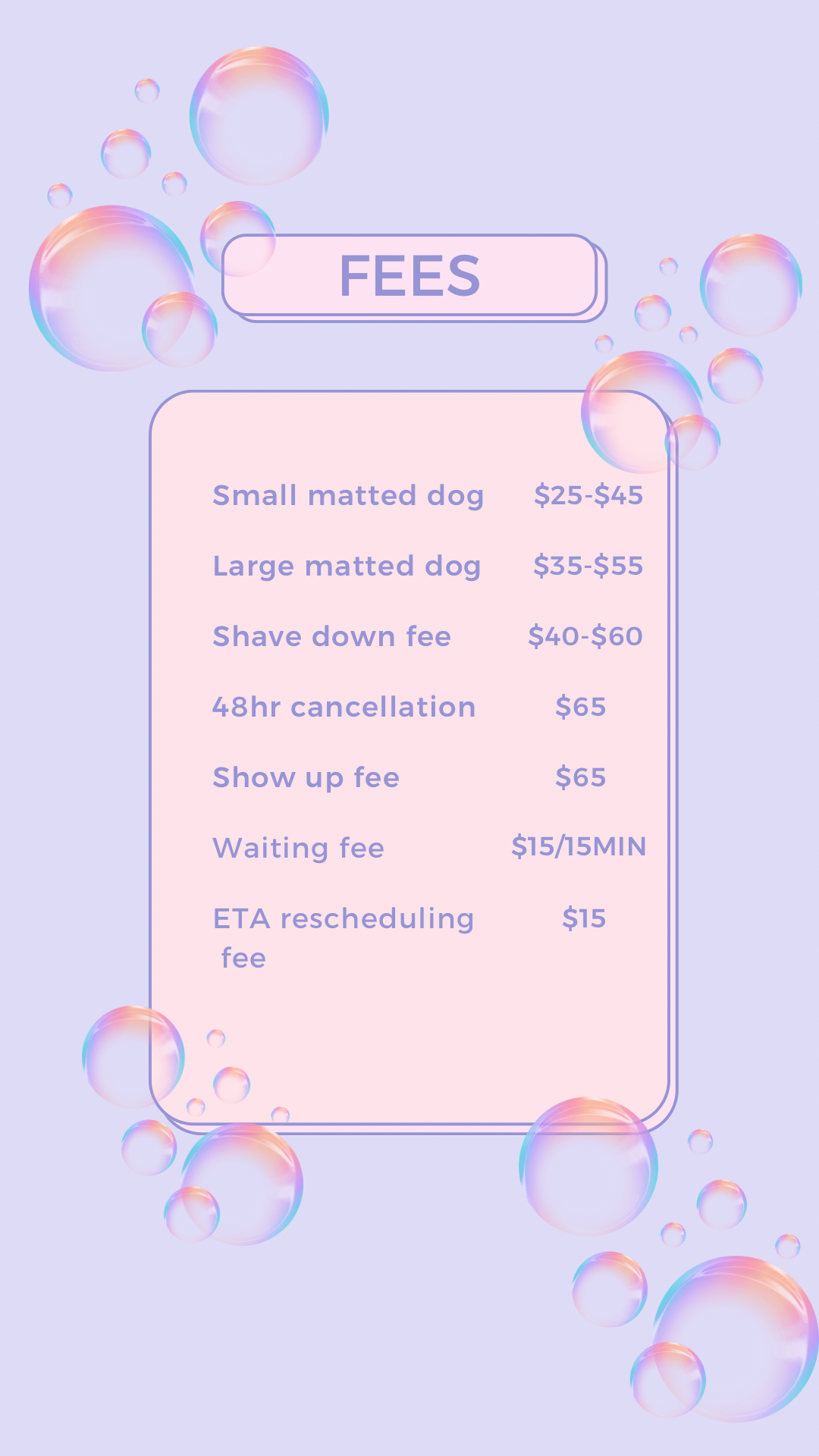 If your dog is matted , it will be shaved and the shave down or matting fee will be applied depending on severity of matting )