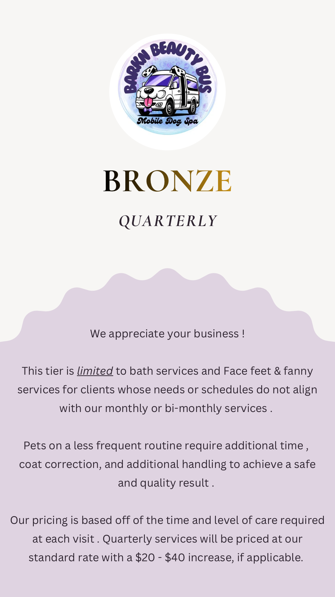 Barkn Beauty Bus reserves the right to refuse any pet if we feel it compromises the safety of your dog or our groomers. Aggressive dogs or dogs who will not get in the van will be refused and charged $65 minimum show up fee for travel , along with additional fees for any work the groomer was able to complete, if applicable .